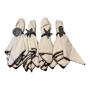 Elevate your dining experience with this beautiful set of four pre-owned Williams Sonoma cotton napkins. The napkins are carefully sourced and come with unique beach themed napkin rings, adding a touch of bohemian, coastal and natural vibes to your table setting. Made of 100% cotton, these beige napkins are perfect for any occasion, from casual backyard barbecues to formal dinner parties. The set comes with a custom bundle of four napkins and napkin rings, making them a perfect addition to your collection. Get ready to impress your guests with this stunning dining accessory.
