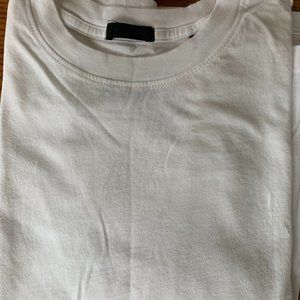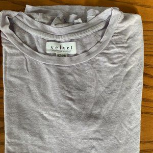 Selling 4 short sleeve tee shirts! Two are white cotton and are by ATM. Another is pale pink with slightly distressed collar by Sundry, and a fourth is lilac and linen, by Velvet. All are somewhat boxy in shape and hit right at the waistband.