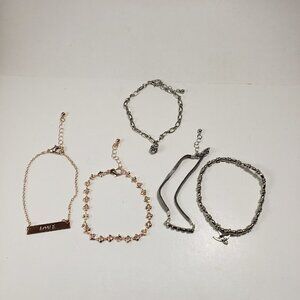 Upgrade your wrist game with this set of 5 bracelets featuring a mix of rose gold-tone, gold-tone, leather, and silver-tone designs, each adorned with charming charms for added flair. NWT