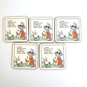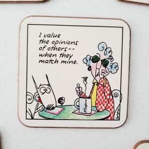 Set of 5 Maxine Coasters by Shoebox/Hallmark. "I Value the Opinions of Others When They Match Mine". Coasters picture Maxine and a dog at a table.