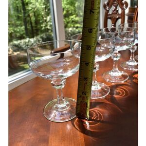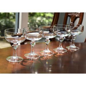 Set of 5 elegant vintage champagne coupe glasses featuring distinctive faceted stems with decorative ball details. The classic wide, shallow bowl design is iconic to mid-century entertaining and the Art Deco era. These versatile glasses work beautifully for champagne, cocktails (especially martinis and daiquiris), desserts, or decorative displays. The geometric stem design and quality construction suggest American or European crystal from the 1950s-1970s golden age of barware.