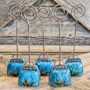 Set of 5, Pier 1 Blue Enamel Floral Purse w Rhinestones-Photo/Place Card Holders with firm metal Tops.