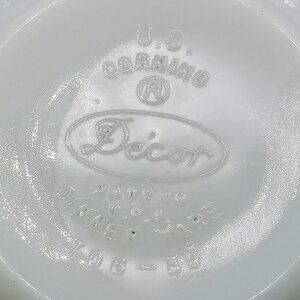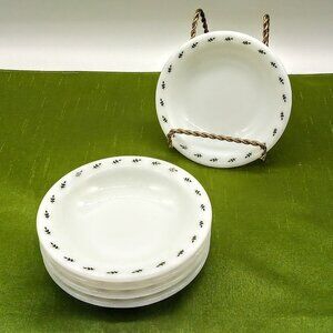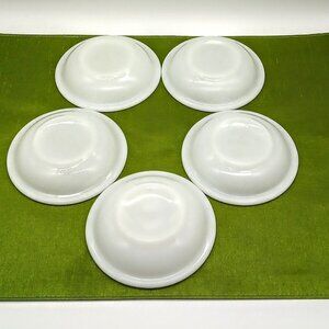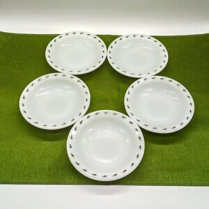 Set of five (5) vintage Corning Décor white glass bowls with dark green leaf pattern on the rim.
