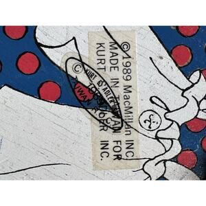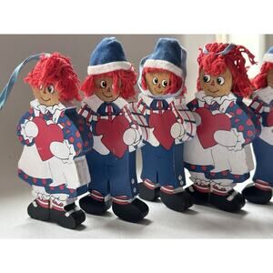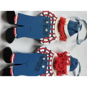 This set of 5 vintage Kurt S. Adler Raggedy Ann & Andy ornaments from 1991 features painted wood figurines of the beloved characters. Each small ornament stands at 4.5 inches tall and comes with a hanging ribbon for easy display on the Christmas tree. The multicolor retro style of the ornaments makes them a charming addition to any holiday decor collection, with a nostalgic touch from the Raggedy Ann & Andy franchise. Made in Taiwan, these original Kurt Adler ornaments are a unique and collectible piece for fans of the classic characters.