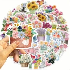 Vibrant floral stickers featuring a variety of flowers in pots and vases. Set of 50 in different colors.