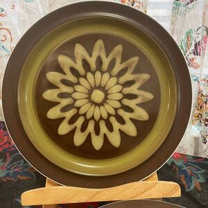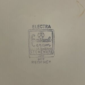 Vintage Electra Casual Ceram “Regency” dinner plates- set of 5. Japanese stoneware, hand painted. One of the five plates has a hairline fracture which is shown in picture, the other 4 do not have any cracks or chips.