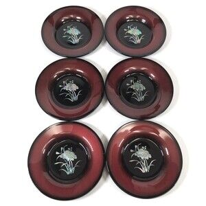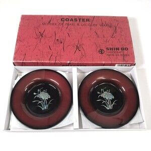 Shin Do COASTERS Mother of Pearl FREESIA FLOWERS Inlay & Lacquer Ware Boxed Set of 6, Vintage. New old stock in original box. Coasters measure 4.75" in diameter. Each is marked on the back (I am assuming the makers mark), but I can't read Korean. The box does show a little wear on the corners etc., it is marked Shin Do Handicrafts Made In Korea. Please see pictures.