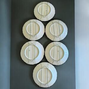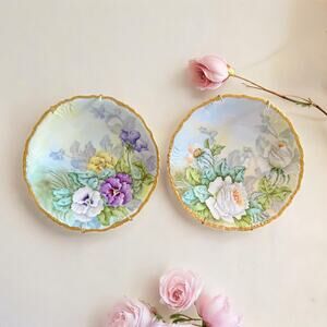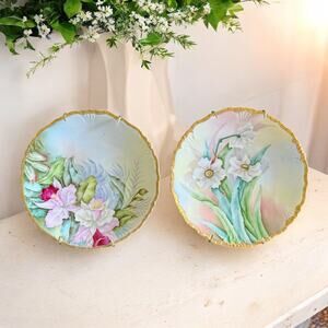 A magnificent set of six antique Limoges porcelain plates from the esteemed Jean Pouyat (J.P.L.) factory in Limoges, France, each beautifully hand-painted and signed by the artist "J.E.F." These plates exemplify the romantic elegance of late 19th to early 20th-century French decorative porcelain, with delicate floral compositions and subtle pastel backgrounds. Circa 1891–1932. Each plate features a unique hand-painted floral motif (roses, pansies, daffodils, peonies, etc.), accented with gilded scalloped rims. Soft luster glaze with fine detailing in petal and foliage work. Plate hangers are included with purchase.