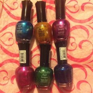 This set of Kleancolor nail Polish comes in metallic pink, metallic sapphire, metallic green, metallic aqua, metallic yellow,and metallic fuschia.. They are bright, shimmery colors that last on your nails and are sure to bring in compliments!