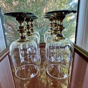Set of six vintage Libbey stemmed glasses featuring clear tulip-shaped bowls and smoky brown glass bases. These classic mid-century style goblets measure approximately 6.5” tall and 2.75” in diameter at the rim. Each glass has the distinctive Libbey look with a rounded foot and stacked-style stem.
