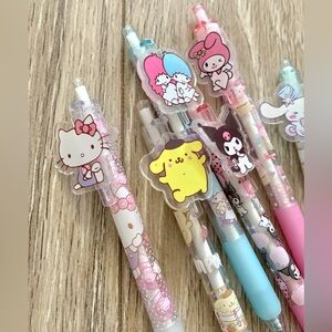Each pen features a kawaii Sanrio friend, including Hello Kitty, Little Twin Stars, My Melody, Korumi, Purin, and Cinnamoroll