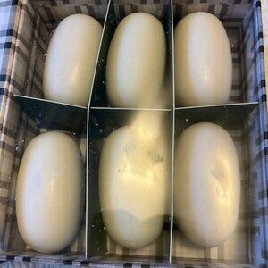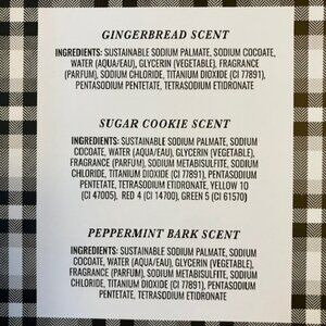 NIB Set of 6 Scented Bar Soaps. Two of Each Scents in Gingerbread, Sugar Cookie and Peppermint Bark. All Packaged in a Festive Christmas Box from Mrs. Claus Gingerbread Baking Company. Green Box with Plaid, Opens by Magnet on the Side, Opening up to Six Bars of Christmas Scented Soaps. Makes a great Christmas Hostess Gift. NIB