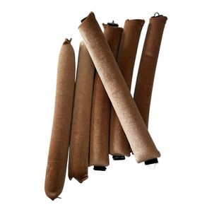 This is a set of 6 velvet no-heat jumbo hair curlers in a beautiful fawn brown. Get a blowout, big bouncy curl look without the heat damage by letting these set overnight while you sleep. There are lots of great tutorials online for using these with great results!