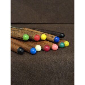 I believe 7 of these are from the same set of forks, and I have a few extras. Marked stainless steel, Japan. Mid century with wooden handles in various different colored ends. Good preowned condition.