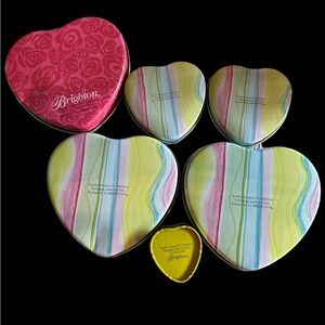 Set of 6 Vintage Brighton Tins - some with inner cards/ most do not. 3 Lg, 2 Med, 1 ring box - Follow your heart” tin has slight dent on back - SEE PICS!! Collectible