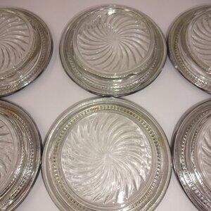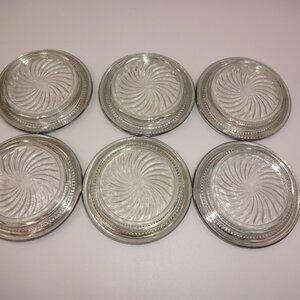 Good pre-owned condition. Six round, clear with silverplate, pinwheel/swirl coasters. Approximate measurements: 3-3/4" x 3/4". Marks/scuffs consistent with age/use.