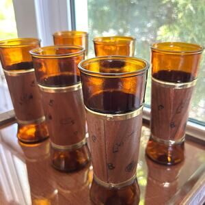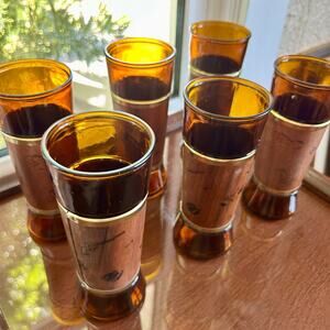 Set of 6 Vintage Siesta Ware Amber Glass Tumblers – Wood Wrap & Gold Trim