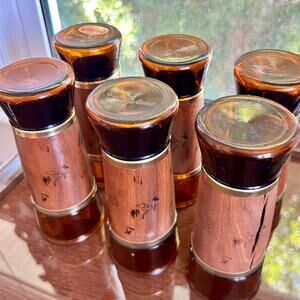 Set of six classic vintage tumblers by Siesta Ware, featuring rich amber glass wrapped in natural wood veneer with gold-tone trim. Each glass stands approximately 6.5” tall with a 2.5” diameter, ideal for cocktails, iced tea, or as standout pieces on a retro bar cart.
