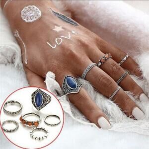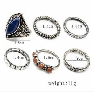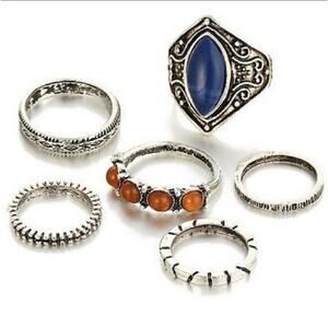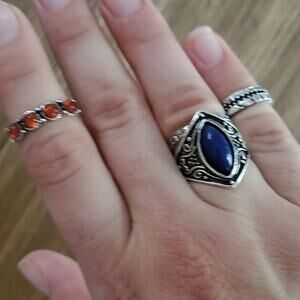 6 engraved silver rings. Rust orange stones run across one. Oval navy stone in the largest one. The other 4 are simple bands with various engraving patterns.