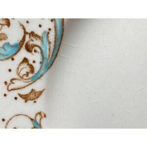 This set of 7 antique bread plates is truly one of the most beautiful patterns I have ever come across. Made by Meakin in England in the late 1890s, the Brierley pattern features delicate hand-painted aqua scrolls, brown dots, and gold trim. This rare and unique pattern is extremely scarce, making it a treasured find for any collector of vintage china.