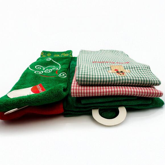 Set of 7 New Old Stock Target Christmas Embroidered Towels Santa Red Green Cotton NWT