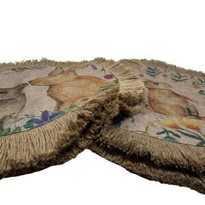 Charming set of 8 round bunny placemats, perfect for Easter, spring, or farmhouse-inspired dining décor. Each placemat features a whimsical bunny motif surrounded by floral details with a textured fringe edge.