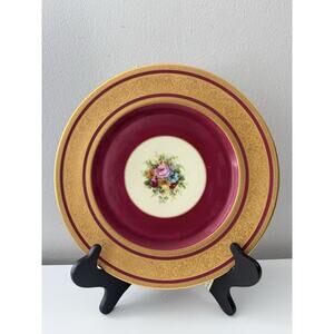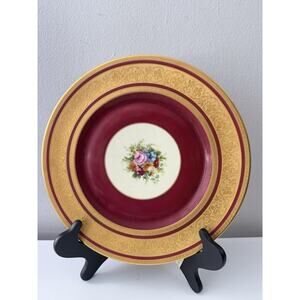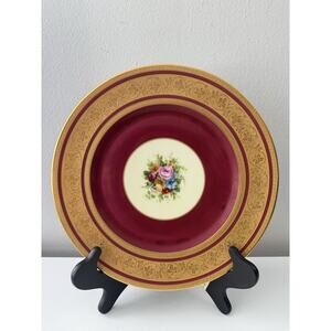 Each plate features a floral centerpiece surrounded by a deep burgundy band and an ornate embossed gold rim with intricate engraved details.