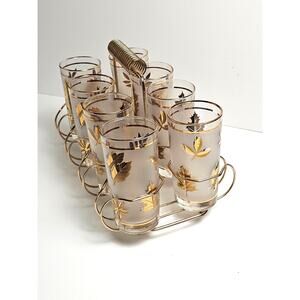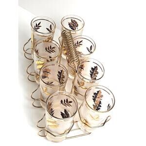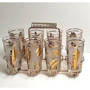 Add a touch of vintage, or MCM, elegance to your home with this beautiful set of 8 Libbey glasses featuring a stunning gold foliage design. These glasses come with a convenient metal carrier, making them perfect for serving drinks at parties or displaying in your home bar. Each glass is in excellent condition, showcasing the quality and craftsmanship of Libbey glassware. The gold foliage pattern adds a sophisticated and timeless charm, ideal for collectors and anyone who appreciates classic design.