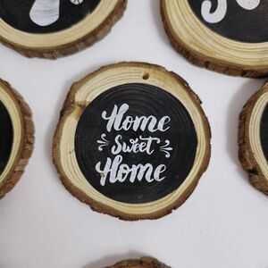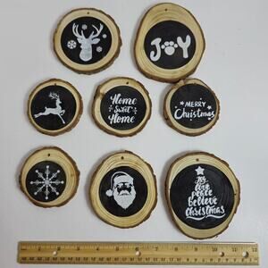 Set of 8 Rustic Wooden Log Pine Chips Black White Christmas Ornaments