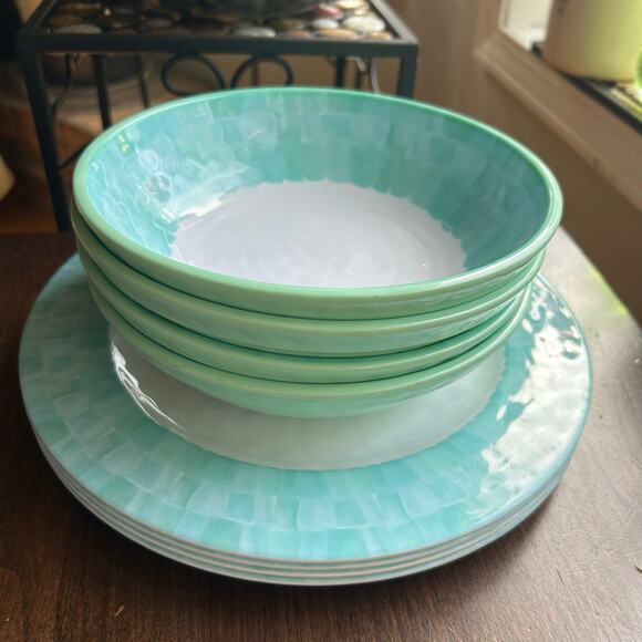 Set of 8 Sigrid Olsen 8" Melamine Bowls White Teal & 11”Dinner Plates