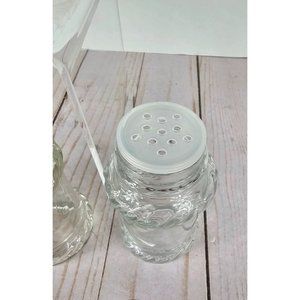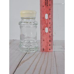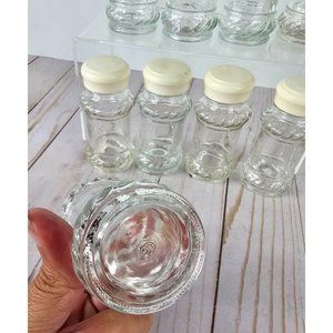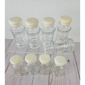 Spice up your kitchen organization with this set of 9 clear glass spice jars featuring a charming rope pattern. The jars come with convenient sifting lids and white screw-on caps to keep your spices fresh and accessible. Note that one jar is missing the white cap, but still has the sifting lid. In great condition and clean, these jars are ready to accommodate your favorite herbs and spices immediately. Their transparent design lets you easily identify your spices at a glance, while the distinct rope pattern adds a stylish touch to your kitchen decor. Measure 3.75" tall.