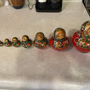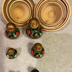 Russian nesting dolls, also known as a Matryoshka doll. Typically made with linden wood, hand-painted and hand-carved.