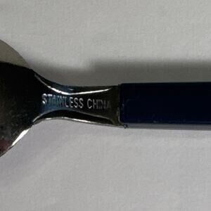 This set of 9 vintage mid-century modern stainless china silverware with blue plastic handles is perfect for both adults and kids. The set includes 9 - 6" spoons, making it ideal for everyday use. The solid blue handles add a fun pop of color to your table setting, while the durable plastic handle material ensures easy cleaning and long-lasting use. This set is perfect for a child's first solid foods.