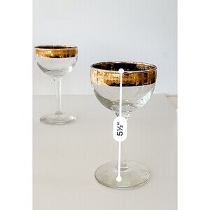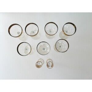 Elevate your drinking experience with these vintage etched gold rimmed crystal wine cordial glasses. The set includes seven pieces of clear crystal glasses with a diameter of 3 inches and a height of 5.5 inches and two cordial glasses with a diameter of 2.5 in and height of 4.5 in. The glasses feature an intricate etched design, making them a perfect addition to your collection for all occasions.