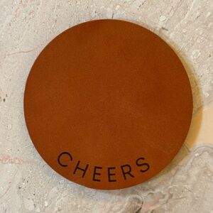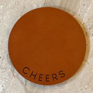 Set of 4 round leather drink coasters in excellent, gently used condition. They are a beautiful cognac color with "CHEERS" stamped in charcoal gray. Solid genuine leather 4" diameter. One coaster has a burnished stripe (as shown in photos) that is in the leather. Handsome bar accessories!