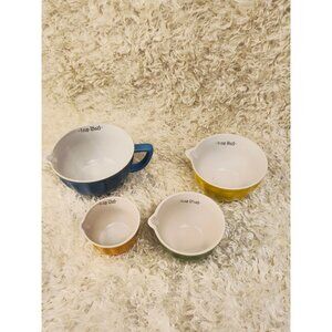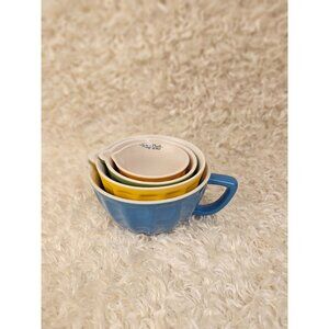 Set of colorful ceramic nesting measuring cups designed to nest for compact storage. The set includes cups for 1 cup (8oz), ½ cup (4oz), ⅓ cup (2oz), and ¼ cup (2oz), as indicated on the cups themselves. They come in a bold, colorful, or vintage-inspired design. They are Designed for accurately measuring dry or liquid ingredients in cooking and baking. Please see pictures for details.