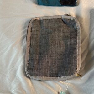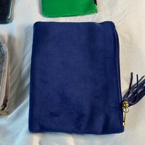 Set of four pouches in blue, green, and gray. Perfect for organizing essentials.