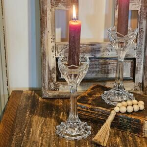 Tall Crystal Lotus Flower Candlestick Holders 7.5". Tall Crystal Lotus Flower Candlestick Holders. Beautiful set. No chips or cracks. Measurements are in the pictures. Add a touch of elegance to your home decor with these stunning Elegant Lotus Flower Crystal Candlestick Holders. Crafted in a vintage style, these candle holders are the perfect accent piece for adding a hint of glamour to any room. The intricate lotus flower design is complemented by the shimmering crystals, creating a beautiful and luxurious look. Whether displayed on a dining table, mantel, or side table, these candlestick holders are sure to impress your guests and elevate the ambiance of your space. Perfect for weddings, parties, or everyday use, these candle holders will add a touch of sophistication to any setting. Candles or decor not included.