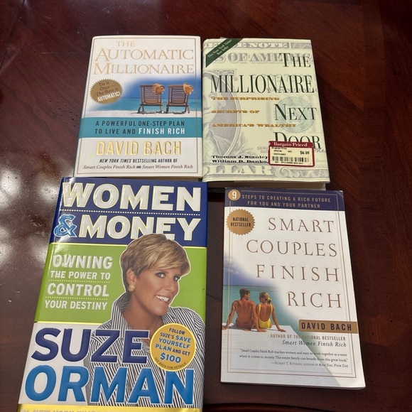 Collection of financial books including titles by David Bach and Suze Orman. Perfect for personal finance enthusiasts.