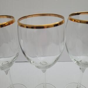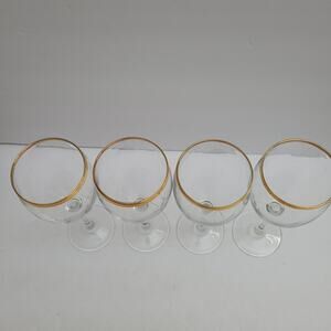 This set features four elegant clear glass wine goblets, each distinguished by a sophisticated gold-tone rim. These glasses often have a classic or vintage aesthetic, such as a mid-century modern style, making them suitable for special occasions or as a refined addition to any barware collection. They are designed to enhance the drinking experience, whether for wine or other beverages, and can serve as a timeless and durable piece of stemware.