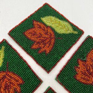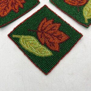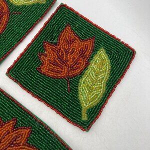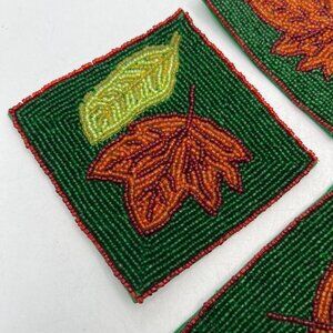 Set of Four Glass Beaded Coasters Fall Leaves Leaf Green Rust Colored