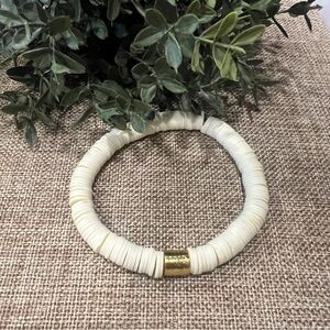 Set of 4 brand new Heishi bead bracelets. Olive green, ivory, charcoal gray and purple. Gold bead accents. Stretchy. Fits approximately 7-7.5” wrist.