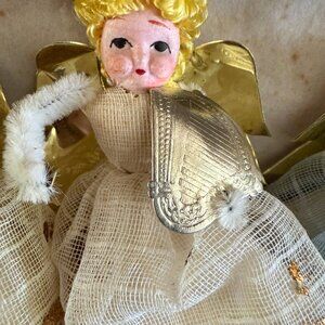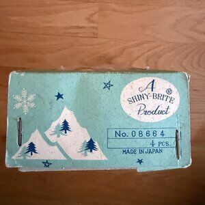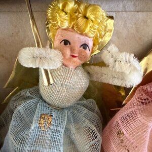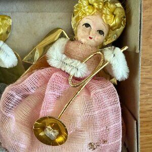 Set of Four Vintage Shiny Brite Christmas Angel Ornaments by Max Eckardt & Sons. Made in Japan in the 1950s or 1960s. The angels feature hand-painted plastic faces, yellow thread curly hair, paper with fabric overlay skirts, and gold foil wings. Two angels in white dresses holding harps, one angel in a blue dress holding a horn, and one angel in a pink dress holding a different style horn. The year on the inside on the paper skirts is difficult to read, but I think it is 1958 or 1959. Hanging holes on the halos and wings. Great vintage condition. Some creasing and curling of the foil wings on the back. Some of the gold trim and decoration on the skirts has worn away.. Original box, but the box has wear and the plastic window insert has been replaced with a piece of plastic wrap. The top of the box also has marker in one spot. Writing on the bottom of the box. There is also a note from someone's Grandma. Delicate and sweet vintage ornaments.