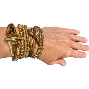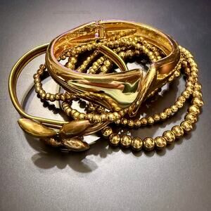 This is a gorgeous set of seven gold tone bracelets - five gold ball beaded stretch ones, a hinged one and a mixed metal cuff featuring a floral center. They are in strong preloved condition and could be worn all together or separately - any which way you wear them, they will dress up any outfit.