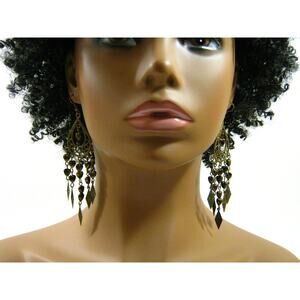 great unique set of handmade earrings - funky tomato red metal waffle earrings with vintage beaded accents 2.75 inch long - Black gray art glass block drop earrings with gemstone accents 2 inch long + long ethnic style chandelier earrings with small antiqued gold hearts 3 inch long