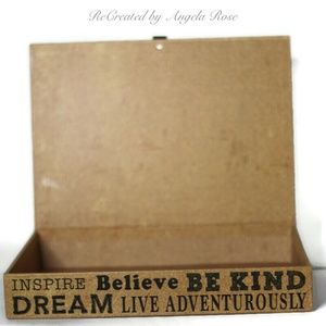 These NWT Decorative Storage Organization Boxes add a modern touch to any room with their brown and black design, featuring inspiring and motivating word phrases. Made of sturdy cardboard, with a faux cork-board design.