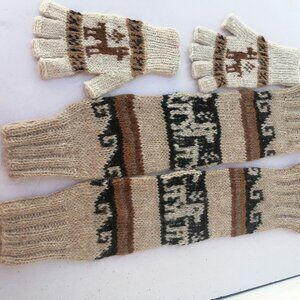 Set of woolen leg warmers and gloves with a llama design. Warm winter. This handcrafted woolen leg warmer and glove set is ideal for protecting you from the cold during the winter. Made by Peruvian artisans, they stand out for their colorful llama designs, a traditional symbol of the Andean region.