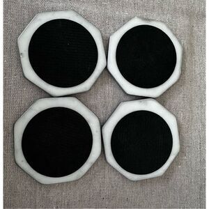 This set has 4 coasters. They have a marble design with some shimmer. The sides of all the coasters are grey. The bottom of the coasters have bumpers.