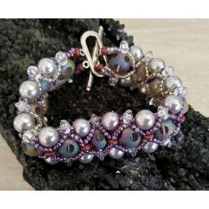 Lavender beads encircle the glass beads, faux pearls on the outer bracelet