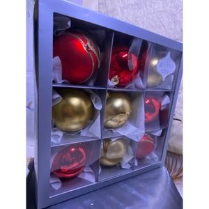 Set of Nine (9), Vitbis Glass Christmas Ornaments 3 in. round, New In Box. Handcrafted Glass Made in Poland, Red / Gold with glitter and jewel embellishments, 6 satin / matte glass, 3 shiny / glossy hanging ball decorations. Gold tone cap with wire loop hanger. This is a gorgeous set of elegant, high end Christmas Tree Ornaments. New in box, Never used, No issues.
